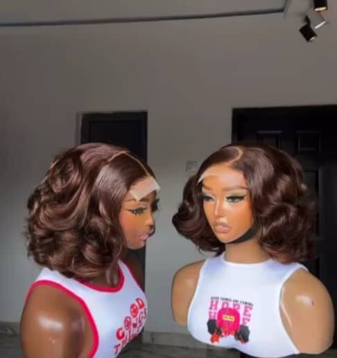 Two mannequins are shown wearing matching wigs styled in a medium-length, curly texture. The curls are well-defined and bouncy, giving the hair a lively and youthful vibe. The natural sheen adds to the overall healthy look of the wigs.